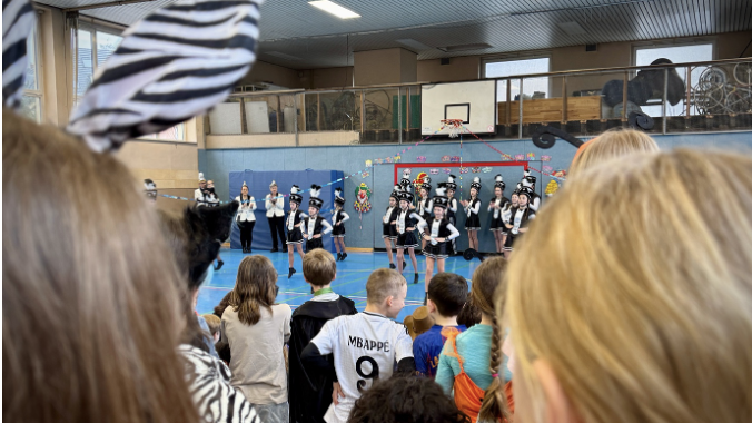 Die Klasse 3d begeisterte das Publikum mit einem lustigen Sketch, bevor die Husaren Schwarz-Weiß mit ihrem beeindruckenden Auftritt für echte Karnevalsstimmung sorgten. Danach zeigte die Klasse 3c ihr tänzerisches Können zum Lied „Wellerman“. Ein besonderes Highlight war auch der Tanz von Antonia und Greta aus der 4a zu „Lush Life“.
