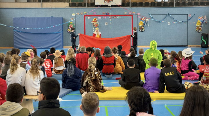 Am Donnerstagmorgen um 9.30 Uhr startete das bunte Karnevalsprogramm in unserer Turnhalle für die Stufen 3 und 4.